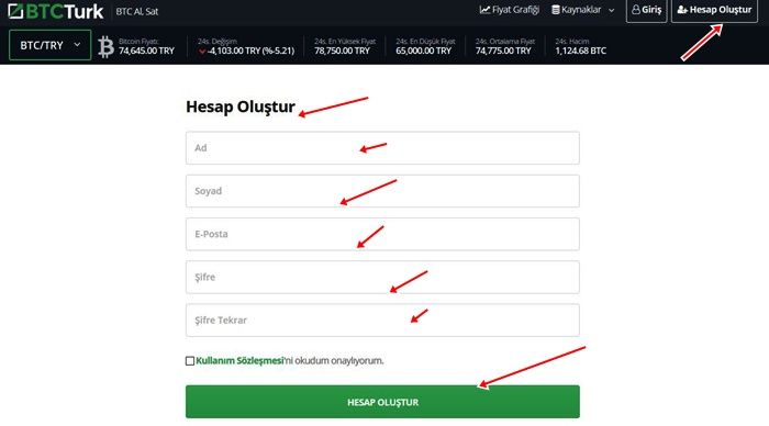 BTC Türk Bitcoin borsası sitesine giriş yaptığınızda ekranın sağ üst köşesinde “HESAP OLUŞTUR” sekmesine tıklıyorsunuz. Bakınız Resim 1