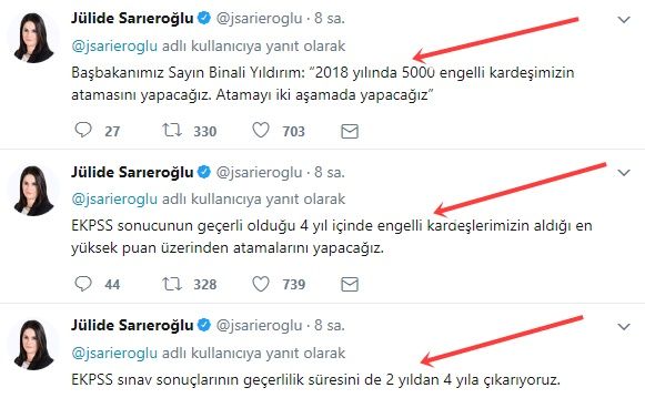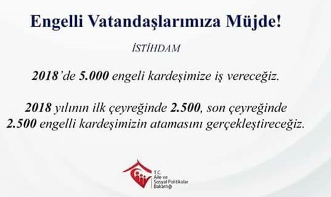 Çalışma bakanın attığı bu twitin hemen ardından Aile ve sosyal politikalar bakanı Fatma Betül sayan şu twiti paylaştı, “Engelli vatandaşlarımıza müjde. İSTİHDAM. 2018’de 5.000 engelli kardeşimize iş vereceğiz. 2018 yılının ilk çeyreğinde 2.500, son çeyreğinde 2.500 engelli kardeşimizin atamasını yapacağız. İfadesini kullandı.