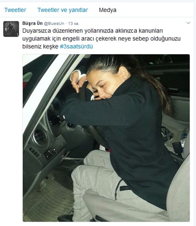 Büşra Ün daha sonra şu tiviti atarak üzüntüsünü bir kere daha belirtti. “Duyarsızca düzenlenen yollarınızda aklınızca kanunları uygulamak için engelli aracı çekerek neye sebep olduğunuzu bilseniz keşke #3saatsürdü”