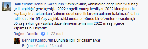 Halil Yılmaz Bennur Karaburun Sayın vekilim, onbinlerce engellinin “kişi başı gelir aşıldığı” gerekçesiyle 2022 engelli maaşı kesiliyor. 2022 Maaşlarında kişi başı hesaplanırken “ailenin değil engelli bireyin gelirine bakılması” daha adil olacaktır. 65 Yaş yaşlılık aylıklarında bu yönde bir düzenleme yapılmıştı. 65 yaş aylığı için yapılan düzenlemenin aynısının 2022 maaşı içinde yapılmasını istiyoruz.